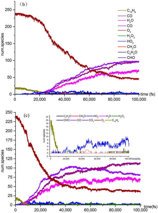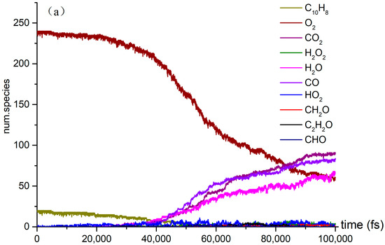 A series of NVE-MD simulations of naphthalene oxidation at elevated temperatures (3000 K, 3500 K, and 4000 K) were conducted as described in Section 2. Additionally, we employed the CHO-2008 force field [22] to simulate the same system in order to investigate the initiation mechanism and combustion dynamics. Figure 2 illustrates the distribution of reactants, products, and intermediate species during the high temperature simulations.