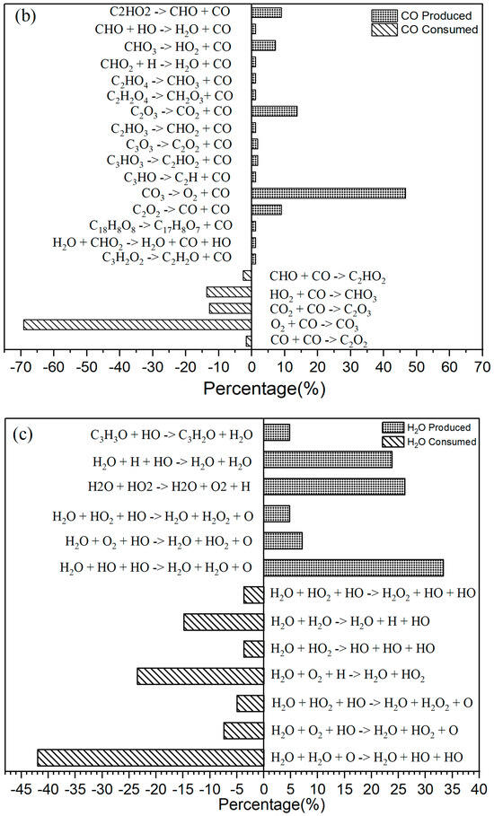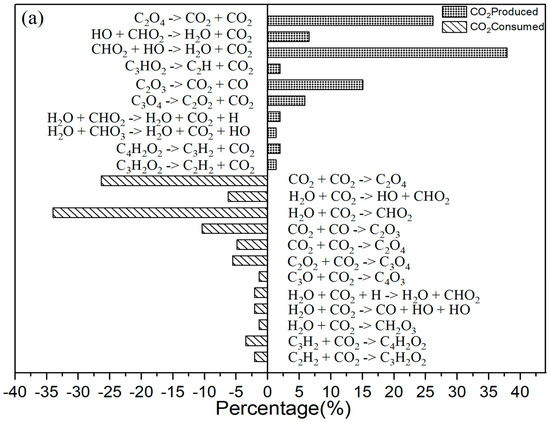 As Figure 3a shows, for CO2 there were 10 positive reactions and 12 negative reactions. Among the positive reactions, the reaction with the highest frequency accounts for 38% (CHO2 + HO → H2O + CO2). In the negative reactions, the reaction with the highest frequency accounts for 34% (H2O + CO2 → CHO2).