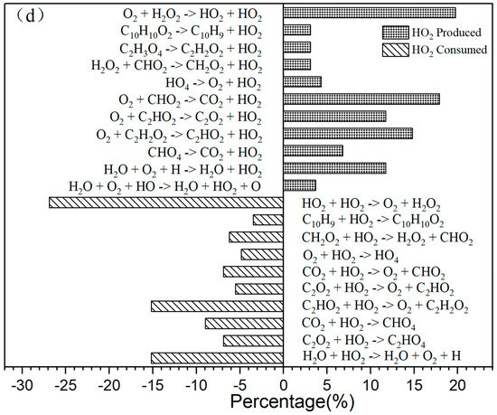 The generation curve data for the HO2 reaction are illustrated in the locally enlarged image in Figure 2c. After 35,000 fs, there is a significant increase in HO2 production. An analysis of the reaction channels presented in Figure 3d reveals that HO2 is involved in numerous oxidation reactions, as well as in the thermal decomposition of hydrocarbons and the dissociation of certain free radicals. These findings indicate that HO2 exhibits strong reactivity and can facilitate various reactions. Within the reaction channel for HO2, there are 11 forward reactions and 10 reverse reactions. The most prevalent reaction is the oxidation of hydrogen peroxide by oxygen (O2 + H2O2 → HO2 + HO2), with the reverse reaction occurring at a frequency that accounts for 27% of the total.