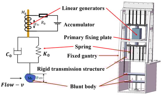 When a fluid flows through a non-streamlined body (called a blunt body), the alternately shedding vortices formed downstream of it generate a cyclical lift force acting on the blunt body, causing the elastically mounted blunt body to undergo a periodic vibration, which further modifies the formation and shedding of vortices []. This interaction between the fluid and the structure is called vortex-induced vibration (VIV), which is a nonlinear, wide-range, fluid-in-motion (FIM) phenomenon with multiple degrees of freedom []. Since the vortex-induced vibration phenomenon contains a large amount of vibrational energy, it can capture hydrokinetic energy from lower-velocity currents and convert it into mechanical and electrical energy.