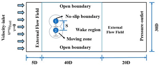 The vortex-induced vibration response is closely related to the blunt body characteristics and fluid characteristics. Changes in blunt body and fluid characteristics directly affect the magnitude of Reynolds number Re, affecting the vortex shedding frequency, shedding velocity, and pressure distribution. Therefore, it is necessary to investigate the blunt body density, spring stiffness, and water velocity. Several important factors may be decisive in determining the VIV characteristics, including the density ratio () and the spacing ratio (S/D, with S being the center distance between the two blunt bodies), and the Reynolds number (Re) is defined in terms of its reference quantity: . The specific parameters are defined as shown in Table 1:
