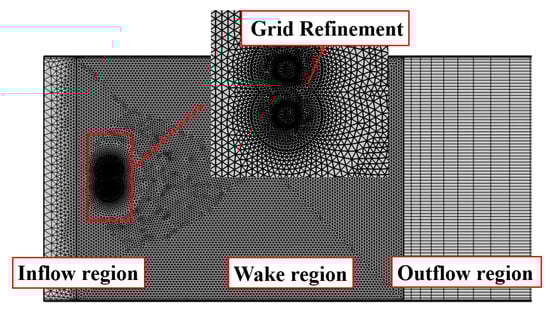 This paper uses a dynamic mesh approach to reconstruct and update the mesh using the Yeoh smoothing method. As shown in Figure 3, the mesh arrangement is near a double cylindrical blunt body. An unstructured mesh is used in the circular region of the computational domain. In order to solve the problem of the high resolution of the flow characteristics around the cylinder, a flow boundary layer is set up in the near-wall region of the cylinder, and a free triangular mesh refinement is performed in its vicinity with a maximum cell size of 0.0091 m. In addition, only the double-circular combination region is defined as the dynamic mesh region to improve computational efficiency. When external fluid forces act on the cylinder, the cylinder oscillates and the mesh is reconstructed to improve model convergence and computational accuracy.