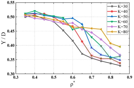 The above analysis shows that the change rule of the vibration amplitude will be affected by the elasticity coefficient. When the density ratio of the blunt body is in the range of , with the increase in the elasticity coefficient, shows the trend of increasing first and then decreasing; the amplitude of in the case of K = 60 is generally higher than the other curves, and in the interval of , under the condition of the same density ratio, the vibration displacement shows a trend of linear growth with the increase in the spring’s elasticity coefficient K. At this time, the points on the K = 80 curve are higher than the other curves. Therefore, different densities of blunt bodies need different elasticity coefficients of the spring in order to achieve the maximum vibration amplitude.