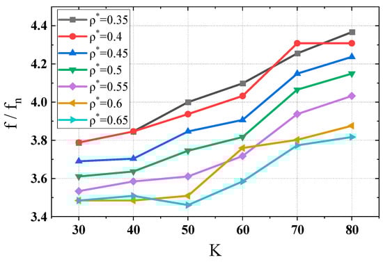 Figure 5 shows the single cylindrical blunt body vibration frequency with the and K change rule. With the increase in the elasticity coefficient K, the cylinder vibration frequency shows a linear increase trend; the larger the spring elasticity coefficient, the more favorable the chance of increasing the vibration frequency of the blunt body, which helps to improve the water flow energy capture. As for the density ratio , the vibration frequency decreases with the increase in , and maximum frequency occurs in the case of K = 80 and 0.35, when is 4.367 at the maximum, which is 1.25 times higher than the minimum vibration frequency. From the analysis of Figure 4 and Figure 5 above, it can be seen that the vibration amplitude and frequency are higher when the value of is smaller, but when the elasticity coefficient K is larger, the vibration amplitude attenuation is serious and the vibration frequency rises. So, the density ratio 0.4, K = 60 for the cylindrical blunt body movement is more ideal, based on this condition for analyzing the later vortex vibration motion.