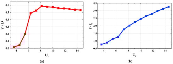 Trend curve of vortex-induced vibration motion of single blunt body with changing flow velocity: (a) vibration amplitude variation curve; (b) vibration frequency variation curve.