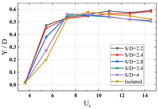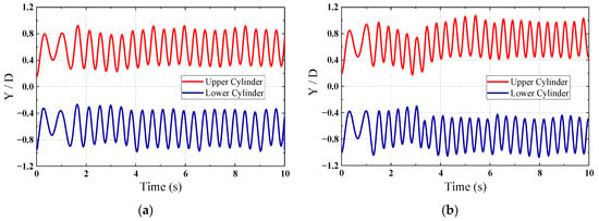 The characteristic parameters of the blunt body and the fluid are determined by analyzing the vortex-induced vibration response of a single cylindrical blunt body. In order to compare the enhancement of the side-by-side double blunt body structure in capturing the energy of the water flow, the vortex-induced vibration of the double blunt body is simulated and analyzed under the same working condition, and the density ratio of the cylinder is selected as . In order to have a better chance of the vortex-induced vibration phenomenon occurring, the conditions set in the simulation are all ideal. Compared with the case of a single cylinder, the fluid–solid coupling problem of a double cylindrical blunt body in water is more complicated. A previous study found a proximity effect when the center spacing ratio S/D is small. The wake interference also affects the vibration response when S/D is large. As shown in Figure 7, since the vortex-induced vibration response of two cylinders placed side-by-side vibrates symmetrically over most of the range of , only the response state of the upper cylindrical blunt body is shown in the following analysis.