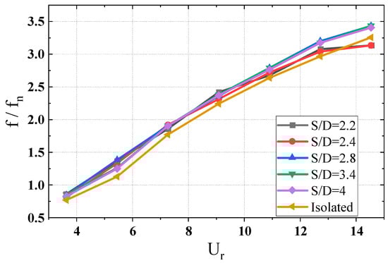 In the case of a single cylindrical blunt body, the vortex-induced vibration is only vortex shedding. However, in the case of double cylinders placed side-by-side, the vortex-induced vibration also comes from the gap flow between the two cylinders. The smaller gap ratio will increase the fluid flow between the cylinders as well as the vortex shedding frequency, as shown in Figure 9. The trend of the vibration frequency of the double-cylinder blunt and single-cylinder blunt is basically the same. The frequency increases with the increase in the approximation velocity for different center distance ratios S/D. Although the larger center distance ratio S/D makes the cylindrical vibration displacement not as good as that of the single-cylinder obturator, the wake interference phenomenon still makes the vibration frequency increase so that the side-by-side double-cylinder obturator appears to be a locking or synchronization phenomenon earlier. The earlier appearance of the locking region is also accompanied by a high vibration amplitude response, which is beneficial to the conversion of mechanical energy in a wide range of water flow velocities. Energy harvesting devices such as the VIVACE require high vibration amplitude and frequency to increase the efficiency of converting kinetic energy into mechanical energy.