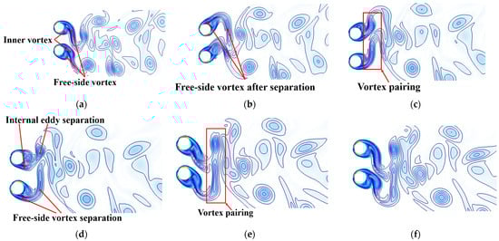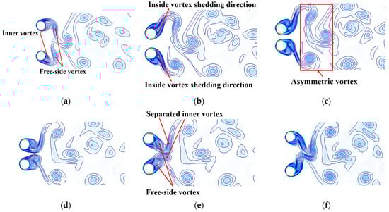Vorticity profile of the reverse motion of the double blunt body at different moments of time (S/D = 2.4): (a–c) show the motion of the double columns approaching to the inside; (d–f) show the motion of the double cylinders separating to the free side.
