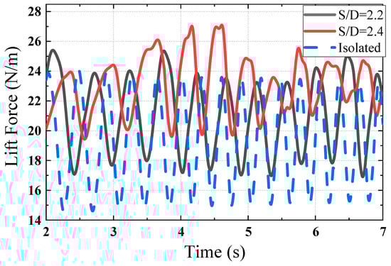 The tendency of the isotropic motion of the cylinders can be clearly seen from the displacement curves in Figure 7a. Figure 10 illustrates the vorticity curves for the isotropic motion of the double cylindrical blunt body at different moments. The gap between the two cylinders is maintained at a constant value, resulting in a nearly constant gap flow. When the two cylinders move downward from the top (Figure 10a–c), the inner vortex of the upper cylinder moves upward. It separates the free side vortex into two parts, and the free side vortex of the lower cylinder merges upward and pairs with the inner vortex of the upper cylinder. However, as both cylinders move upward from the bottom (Figure 10d–f), the free side vortex of the lower cylinder separates and, due to the influence of the free side vortex of the upper cylinder, the inner vortex of the upper cylinder is split into two parts, one of which is paired with the free side vortex. The process is related to the vortex-shedding process studied by Chen et al. []. From Figure 11, it can be seen that when the in-phase vortex shedding mode occurs, there is no significant increase in the peak lift, but the average lift reaches 20.98 N compared to the single blunt body structure by a factor of 1.08.