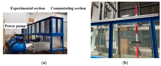 Laboratory circulating water tank physical image: (a) circulating flow type water tank physical picture; (b) flow meter test position.