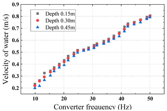 In order to simulate the uniform fluid flow in the ocean, a circulatory flow type tank, as shown in Figure 13a, has been constructed in the laboratory. It includes a rectification section, a test section, and a power control system. The flow velocity in the frequency range of 0–50 Hz was tested by using a tachometer and setting the sampling period to 5 min to calculate the average value of the flow velocity during the sampling period. The installation position of the tachometer is shown in Figure 13b. The relationship between the flow velocity and the frequency of the inverter was measured at water depths of 0.15 m, 0.3 m, and 0.45 m, respectively. The test results are shown in Figure 14. The flow velocity at different depths and the frequency of the inverter satisfy the law of linear change, and the flow velocity is relatively low under the condition of greater water depth. The flow velocity range in the test section is 0.2–0.8 m/s, the instability of the flow velocity is less than 1%, and the whole can fulfill the conditions of the water flow velocity of the vortex-induced vibration power generation system. Therefore, when the vortex vibration capture experiment is carried out in the circulating water tank, the initial position of the blunt body should be selected as the appropriate water depth in the tank.