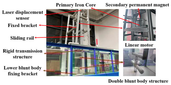 The vortex-induced vibration power generating unit is divided into three parts, as shown in Figure 15. The lower part is a double cylindrical blunt body vortex-induced vibration-capturing device. The upper cylindrical blunt body is rigidly connected to the transmission structure by two perforated steel plates to ensure that the blunt body moves in the transverse direction of the water flow and transmits the vibration mechanical energy to the linear motor. The lower cylindrical obtuse body is fixed to the lower fixed frame by two sliding rails because the two cylindrical movements exist in the same direction and reverse two kinds of movement states, so the lower cylindrical blunt body only plays the role of reinforcing the vortex-induced vibration movement. It is not connected to the transmission structure. The transmission structure connects the upper cylindrical obtuse body and the linear motor secondary magnet to ensure the consistency of the movement of the obtuse body and the secondary magnet, which is supported by two sliding guide rails to ensure the verticality of the whole device, and no inter-structural deformation occurs. The linear generator consists of the primary iron core and the secondary permanent magnet. The primary iron core is fixed on a fixed bracket with multi-turn coils wrapped inside to cut magnetic force lines and convert electrical energy. The secondary magnet of the linear generator is partially fixed inside the transmission structure, connecting the blunt body and the motor into one part to minimize the loss in the energy transmission process. When the cylindrical blunt body undergoes periodic vibration, it directly drives the secondary side of the linear motor to move and realize electric energy conversion. A laser displacement sensor is installed at the top to measure the amplitude and vibration frequency of the cylindrical blunt body.