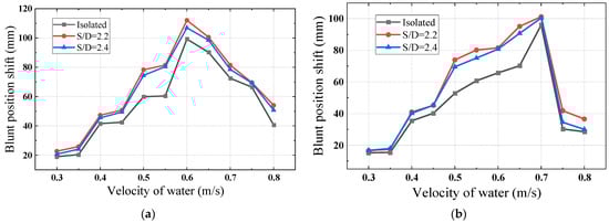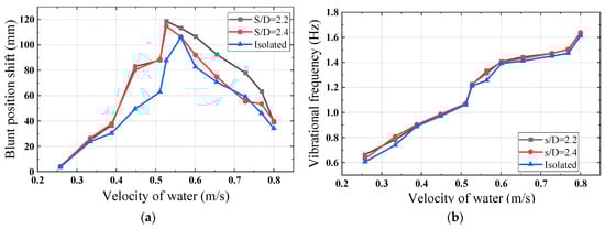 Figure 16 shows the influence curve of a different flow velocity on the vibration displacement and frequency of the passivate body; from the overall trend, the vibration displacement curve of the two sets of devices all show the trend of increasing and then decreasing, and due to the influence of two cylindrical proximity effects, the double passivate body structure reaches the peak value in advance at a flow velocity of 0.527 m/s. The vibration frequency shows the same increasing trend, and with the increase in flow velocity and vibration frequency acceleration, double cylindrical obtuse body structure vibration displacement and frequency are generally higher than the single cylindrical obtuse body. From the specific analyses in Figure 16a, it can be seen that in the single cylindrical blunt body capture structure, the large amplitude region is 0.527 m/s ≤ ≤ 0.655 m/s within the flow velocity range, and the maximum vibration displacement of 105.992 mm occurs at a flow velocity of = 0.564 m/s. The maximum vibration displacement of 105.992 mm occurs at a flow velocity of = 0.564 m/s. The maximum vibration displacement of 105.992 mm occurs at a flow velocity of 0.564 m/s. For the double cylindrical blunt capture structure, the vibration displacement is larger than that of the single cylindrical blunt capture structure at different flow velocities, indicating that the ability of the double cylindrical blunt capture device to capture high-amplitude vibrations is better than that of the single blunt capture device. The double blunt capture structure has a larger vibration displacement in the flow velocity range of 0.448 m/s ≤ ≤ 0.728 m/s, which is wider than the large amplitude region of the single cylindrical passivate structure. The maximum vibration displacement occurs at S/D = 2.2, the flow velocity is = 0.527 m/s, the two cylinders interfere more strongly, and the peak displacement is 118.557 mm, which is 1.12 times higher than that of the single-cylinder blunt structure. This is because the flow rate of water in the laboratory flume is not an ideal uniform flow rate, and the influence of some factors, such as the side walls of the flume, leads to a narrower locking region of the blunt body compared to the ideal case. As can be seen from Figure 16b, the cylindrical vibration frequency increases as the flow velocity increases. The vibration frequency of the double blunt body structure has a slight increase compared to the single cylindrical blunt body because the instability of the water flow makes the vortex formed in the trailing region of the cylinder have multiple harmonic frequencies, which interferes with the vortex-induced vibrational motion of the blunt body. The numerical results did not predict the experimental results very accurately. One of the possible factors contributing to this problem is that the simulation model eliminates the cylinder length effect, whereas the finite cylinder in the vortex-excited vibration experiments induces fluid flow between the cylinder tip and the channel wall.