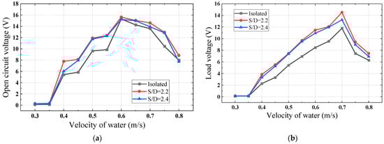 As shown in Figure 18 for the generator voltage amplitude under different load conditions, because the electromagnetic resistance is larger under the generator load condition, the load voltage is also smaller than the no-load voltage as a whole with the decrease in the obturator vibration amplitude, and the motor voltage amplitude shows a trend of increasing and then decreasing along with the trend of the vibration amplitude of the cylindrical obturator. As shown in Figure 18a, when the flow rate = 0.6 m/s, the no-load peak voltage reaches 15.64 V, and when the flow rate > 0.6 m/s, although the vibration frequency is increased, the decrease in amplitude causes the vibration speed to slow down, resulting in a reduction in the output voltage. When a resistive load is applied to the output of the linear motor, the vibration amplitude and frequency of the blunt body receive a serious suppression effect due to the increase in electromagnetic force, the total voltage amplitude is lower than the no-load state, and the peak voltage is reduced to 14.52 V, which is a reduction of 7.16%.