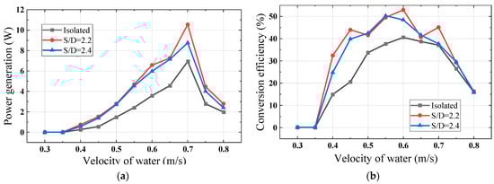 Figure 19 shows the changing curve of output power and conversion efficiency: the load resistance value is constant, even with the increase in load voltage, the output power shows a trend of increasing and then decreasing, the output power of the double obtuse structure is higher than that of the single obtuse structure, and the maximum output power of the single obtuse structure is 1.53 times. The energy conversion efficiency can be seen in Equation (12); because it is the relationship of the ratio between power generation and water flow energy, it is not a smooth curve, and the curve of the double obtuse structure is also higher than the single obtuse structure as a whole, and the conversion efficiency is improved by 12.33%. As shown in Figure 19a, in the range of flow velocity < 0.7 m/s, as the flow velocity increases, the output voltage increases, and the output power of the linear generator increases, which is consistent with the voltage magnitude curve, and a maximum output power of 10.55 W is obtained at a flow velocity = 0.7 m/s. From the curve, it can also be found that the output power of the double cylindrical blunt body is generally higher than that of the single cylindrical obturator. As shown in Figure 19b, the energy conversion is the highest when the flow velocity = 0.6 m/s. The maximum energy conversion efficiency is 52.93%, which is not the point of the flow velocity where the output power is the largest; the reason is that with the increase in the vibration amplitude and frequency of the cylindrical blunt body, the energy conversion efficiency of the water flow is also increased. The energy conversion rate of the water flow is faster, which makes the peak point of the energy conversion efficiency and the peak point of the output power. The peak point of the energy conversion efficiency and the peak of the output power do not coincide.