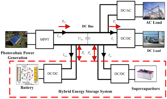 In the PV DC microgrid with HESS, batteries typically serve as the primary energy storage devices, while SC function as auxiliary energy storage units [48]. When the power generation from the PV system becomes unstable, the battery engages in charging and discharging to absorb or compensate for excess energy within the microgrid. However, excessive charging and discharging can adversely affect the battery’s lifespan. Although super-capacitors have significantly lower energy storage capacity compared to batteries, their charging and discharging processes are based on physical mechanisms, allowing for a greater number of cycles and an extended lifespan. Given these considerations, it is advantageous to employ a combination of batteries and super-capacitors for energy storage. In this arrangement, the super-capacitor accommodates high-frequency power demands, while the battery primarily handles low-frequency power requirements, thereby collectively ensuring the stability of the microgrid.