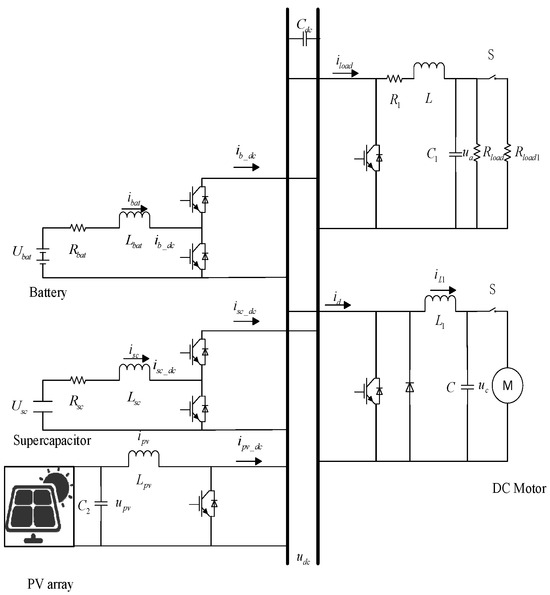 The structure of the PV DC microgrid system constructed in Figure 1, which is mainly composed of photovoltaic cells, battery, super-capacitor, loads, and various DC converters. The photovoltaic cell is connected to the DC bus via the Boost converter and operates in maximum power point (MPPT) mode [46]. The battery and super-capacitor are connected to the DC bus through a Bidirectional DC/DC Converter (BDC) that enables bidirectional energy flow and compensates for system power imbalances to ensure safe and stable operation. The system’s load comprises ordinary resistive and motor loads connected in parallel to the DC bus through a Buck converter.