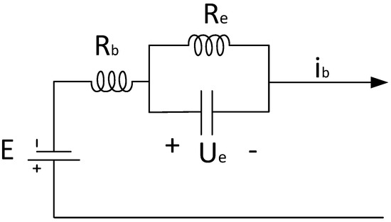 In this paper, the Thevenin equivalent circuit model is employed to analyze the battery, and its representation is illustrated in Figure 4. It consists of a DC voltage source , a polarization resistor , a polarization capacitor , and internal resistance .