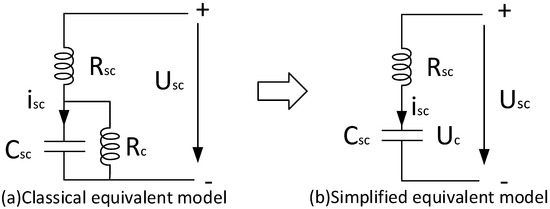 The equivalent series resistance depicted in Figure 5a diminishes the charging efficiency of the SC, with its resistance value typically being relatively low. Conversely, the leakage current associated with the equivalent parallel resistance adversely affects the energy storage performance of the super-capacitor, where the resistance value is generally higher. In practical applications, SCs undergo frequent charging and discharging cycles, which have a negligible impact on their operational characteristics. Consequently, the simplified equivalent model of the SC comprises an ideal capacitor in series with an equivalent series resistance .