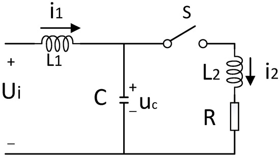 The switch S is disconnected, and the DC motor is disconnected from the main circuit. The equivalent circuit diagram is shown in Figure 6b. It is listed by Kirchhoff’s voltage and current law: