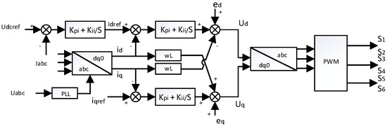 Figure 9 shows the DC bus voltage, is the DC side filter capacitor, , and are the inverter terminal voltage, L is the filter inductor, R is the equivalent resistance, and , are the three-phase power supply voltage, , and are the inverter bridge arm side current. To simplify the controller design of the inverter, the three-phase stationary coordinate system is transformed from Clack (abc → αβ) to Park (αβ → dq0), resulting in the DC component represented in the dq0 coordinate system, which maintains the same fundamental frequency as the microgrid. This transformation alleviates the complexity associated with the inverter’s controller design. The grid-connected DC/AC inverter employs a voltage outer loop and a current inner loop with feedforward decoupling control, while the current regulator utilizes PI control. PI controller can effectively balance the steady-state and dynamic performance of a control system. By incorporating a current inner loop within the voltage loop, the system’s dynamic response speed can be significantly enhanced, thereby reducing the impact of load disturbances in a timely manner. The control strategy block diagram is illustrated in Figure 10.