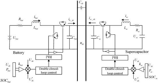 The main circuit topology of the PV DC microgrid in the off-grid state is illustrated in Figure 2. Main circuit topology of DC microgrid. and denote the terminal voltage (V) of the battery and the SC respectively. represents the energy storage inductance (H) of the battery; is the energy storage inductance (H) of the SC; and stand for the parasitic resistance (Ω) of the battery and super-capacitor energy storage inductors, respectively. By applying Kirchhoff’s current theorem, the dynamic equation of the DC microgrid can be derived as follows: