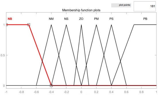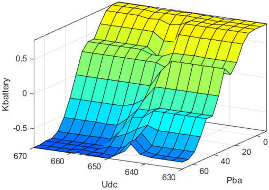 The traditional droop control method encounters difficulties in appropriately assigning droop coefficients based on power fluctuations with varying frequency characteristics. Moreover, unpredictable factors such as load mutations within the system can influence the allocation characteristics. Consequently, traditional droop control struggles to ensure precise power allocation among HESS units. This research merges the characteristics of a fuzzy control algorithm with droop control to develop droop coefficients for charging and discharging processes. The adjustment law for droop coefficients takes into account output power, SOC, and DC bus voltage to minimize bus voltage fluctuations around its rated value. The energy storage device effectively stabilizes bus voltage in response to external changes or variable loads, improving the system’s anti-interference capabilities. Throughout charging and discharging, the energy storage device optimizes power distribution based on SOC values, ensuring that devices with low SOC receive high charging power and low discharge power, while devices with high SOC receive low charging power and high discharge power. Real-time dynamic adjustment of droop coefficients and optimization of the droop curve facilitate efficient power distribution in HESS units [48,51]. Due to the distinct working characteristics of batteries and SCs, separate fuzzy-droop controllers are recommended for each to achieve precise power distribution. To accomplish this, unbalanced power should be divided based on frequency, with low-frequency power assigned to batteries and high-frequency power allocated to SCs.