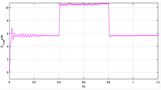 The PV cells in the DC microgrid simulation model output 7.5 kW, as depicted in Figure 26. Upon connection to the load at 0.4 s, the bus voltage experiences an instantaneous decrease, with the power change in the load portion illustrated in Figure 27. The steady-state power values are 5.6 kW under low load and 10.5 kW under high load, with a system power deficit of 3.0 kW. The energy storage unit charges during low load periods, while the deficit power of the system is compensated for by the battery and super-capacitor during high load scenarios.
