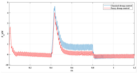 When the load is suddenly increased by 0.4 s, the energy storage unit is impacted by the droop control, leading to a quick power response. Figure 28 illustrates a comparison of power response curves for the battery branch under traditional droop control and fuzzy-droop control. Simulation results indicate that both control strategies result in power response oscillations, with peaks of approximately 4.0 kW and 3.5 kW at 0.45 s, respectively. Notably, the fuzzy-droop control minimizes power oscillation amplitudes, enhancing system disturbance rejection and response speed. Additionally, when the load is disconnected at 0.8 s, the battery power sharply drops to −0.17 kW under traditional droop control, causing significant vibration. In contrast, the adaptive fuzzy-droop control strategy shows faster system convergence post-disconnection. This strategy effectively enhances system dynamics, stability, and robustness in a PV DC microgrid. Power response curves for the SC branch under both control strategies are depicted in Figure 29. Figure 30 is the waveform of the DC bus voltage of the microgrid when the HESSs works in the adaptive variable universe fuzzy-droop control under the condition of load mutation.