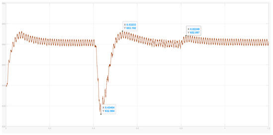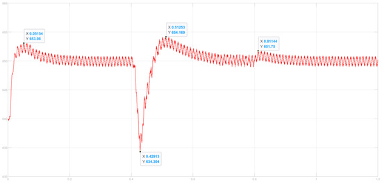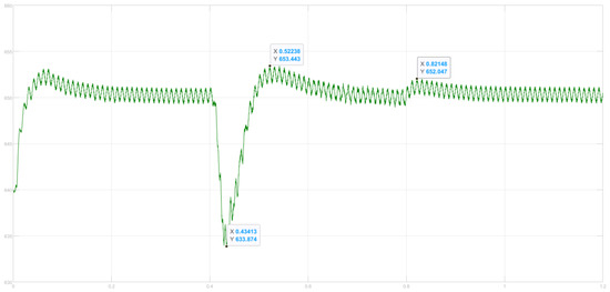 When the load is connected at 0.4 s, the bus voltage instantaneously decreases. With droop control, the voltage drops by 18.30 V (see Figure 31). Using MHHO adaptive variable universe fuzzy droop control, the voltage drop is reduced to 15.70 V (see Figure 30). By compensating with the bus capacitor and HESSs, the bus voltage quickly rises above 650 V. The voltage increases by 4.4 V with droop control and by 4.1 V with MHHO adaptive variable universe fuzzy droop control. The bus voltage returns to 650 V around 0.65 s. Upon disconnecting the impulse load at 0.8 s, the droop control voltage rises by 4.2 V, the MHHO adaptive variable universe fuzzy droop control voltage rises by 1.75 V. The MHHO control shows a smaller increase compared to the traditional method. By utilizing bus capacitor absorption, the bus voltage returns to 650 V at 0.9 s. Simulation results demonstrate that the MHHO-based adaptive variable universe fuzzy droop control provides better voltage stabilization. Therefore, the adaptive fuzzy controller based on MHHO proves crucial in adjusting the droop coefficient.