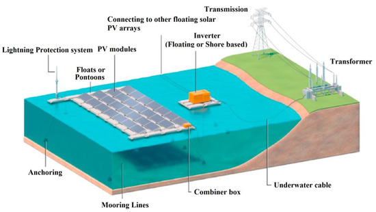 The major components of FPVSs essentially consist of PV panels with their supporting electrical components and body construction that involves floats, mooring systems, waterproof materials, and buoyant force [88,89,90]. Figure 2 depicts a typical standalone FPV system.