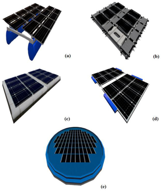 FPV types: (a) Type 1: Class 1 pontoon structure, (b) Type 2: Class 2 pontoon structure, (c) Type 3: Class 3 pontoon structure (d) Type 4: Superficial rigid structure, and (e) Type 5: Superficial flexible structure [97,98,99].