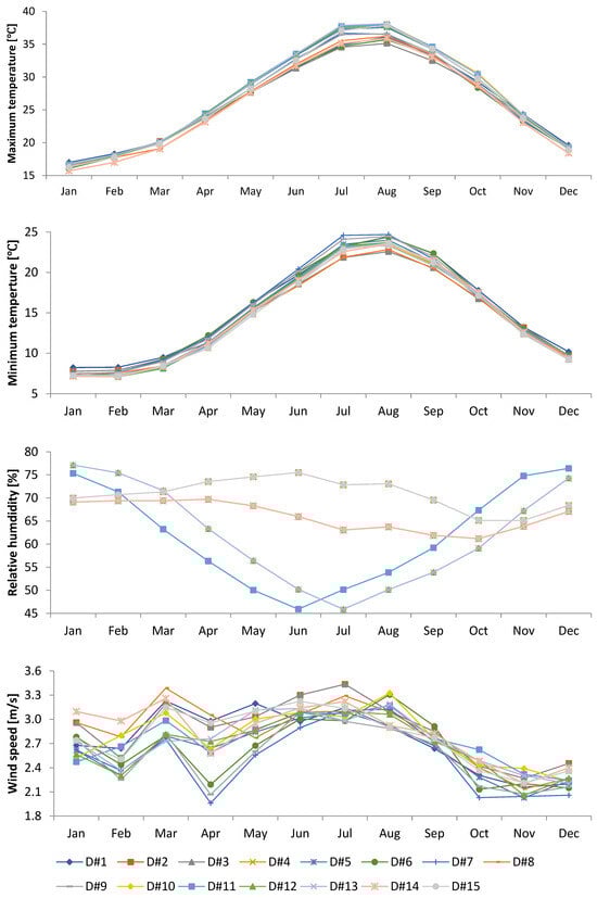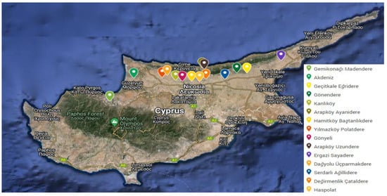 Cyprus, with a 9251 km2 area, is the third largest island in the Mediterranean. It is situated in the Mediterranean’s eastern region. Cyprus has a typical Mediterranean climate, meaning there are distinct seasons and substantial variations in temperature, precipitation, and overall weather patterns. The weather is hot and dry in summer, from mid-May to mid-September, and wet and volatile from early November to mid-March, divided by two brief seasons, spring and fall. During the summer, the island experiences high temperatures caused by the Great Continent passing over Central Asia. It is regarded as a season of high temperatures and nearly clear skies. In winter, Cyprus is subject to a few successive depressions that cross the Mediterranean Sea from west to east between Eurasia and the African belt. These depressions cause atmospheric disturbances, leading to the most rainfall of the year taking place in this season. The average annual rainfall is about 500 mm, with the maximum and minimum values of 759 mm and 182 mm recorded in 1968–1969 and 1972–1973, respectively. Generally, dams are constructed across rivers to recharge aquifers, store surface runoff for use during future dry seasons, and occasionally minimize hazardous flooding. Northern Cyprus experienced a shortage of water in 1960, which prompted the construction of dams. After realizing the importance of dams and ponds as renewable water resources, Turkey’s State Hydraulic Works (DSI) rapidly established 41 reservoirs with varying capacities. Of these, eighteen were constructed for irrigation and twenty-three were constructed to prevent temporary streams from going straight into the Mediterranean Sea. Consequently, these infrastructures have accomplished the tasks for which they were designed. Over 27 million cubic meters (MCM) of water are taken annually from 28 streams in Northern Cyprus. About 43 MCM of water is also released annually by ten seasonal streams that rise from the Troodos Mountains in Southern Cyprus. However, these rivers’ upstream portions have since been dammed in the southern part of the island. In this study, 15 reservoirs/dams have been considered to assess the potential of floating photovoltaic installations. Table 1 tabulates the selected reservoirs/dams, and Figure 4 shows the locations of the selected reservoirs/dams. Moreover, Figure S1 in the Supplementary Materials presents the long-term averages of solar resources, including Global Horizontal Irradiation (GHI), Global Tilted Irradiation (GTI), Direct Normal Irradiation (DNI), Air temperature (AT), and Global Tilted Irradiation (GTI) as generated by Global Solar Atlas, the principal phenomena of climate that determine solar power generation.