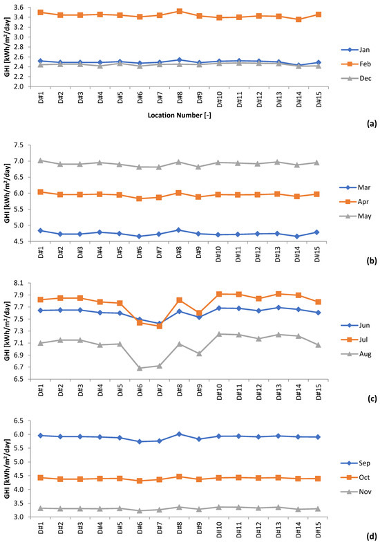 The most fundamental factor that determines the feasible locations for solar power plants and floating PV systems is GHI [118,119]. According to Castillo et al. [120], GHI can be defined as the solar energy (light) arriving at the surface of the Earth every year. Therefore, finding the location of SI is essential for evaluating the performance of the system [121]. According to Gökmener et al. [122], Suh and Brownson [123], and Wang [124], PV systems give better performances in sunnier regions.