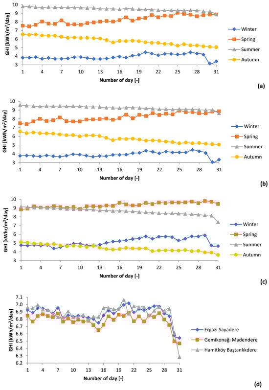 Generally, it is challenging to design solar energy systems in a location where the measurement data are not available. The number of stations and data is limited in Northern Cyprus. It is considered a major problem for working with the observed rainfall records. Thus, it is necessary to evaluate the satellite climate dataset products with locally measured data before utilizing these products as sources for evaluating the performance of solar energy systems at the specific location. In the literature, NASA, a leader in space technology, provides model-based and satellite products via its network of satellite systems, which are essential for addressing agricultural needs, increasing energy efficiency, and studying climate dynamics [108,109,110]. The NASA Earth Science Research Program’s POWER (Prediction of Worldwide Energy Resources) Project made this possible. With a spatial resolution of 0.5° × 0.5°, this worldwide grid offers solar and meteorological data from 1981 onward and covers areas without surface meteorological observations [108,109,110]. The POWER data from NASA is freely available to users. Several studies evaluated the potential for solar energy in different regions using the NASA database [111,112,113]. Moreover, a robust association between observed data (GHI) and the NASA database was shown by Belkilani et al. [114], Gairaa and Bakelli [115], and Tahir et al. [116]. Moreover, solar radiation can be considered constant over large areas, ignoring the effect of cloud absorption, according to Bhatia [117].