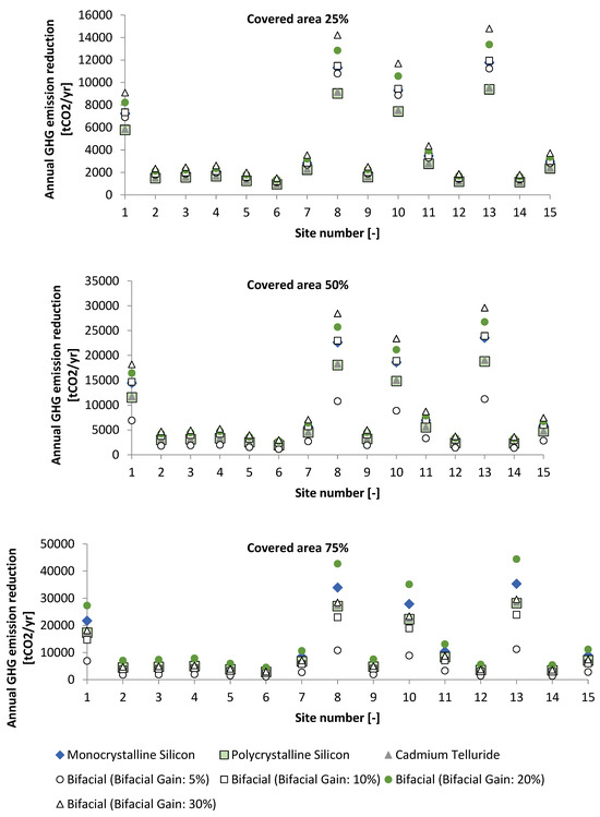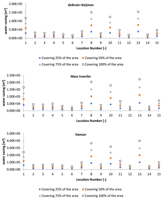 The floating photovoltaic system is one of the potential techniques that may be utilized to mitigate evaporation from open water surfaces [149,153]. In this research, a floating photovoltaic system was implemented to reduce the evaporation rate. This study investigated four different covering ratios of the reservoir/dam’s surface: 25%, 50%, 75%, and 100%. The surface area of the reservoir/dam is calculated with Google Maps. The water savings from installing a floating PV system are estimated using Equation (12) [149,154].