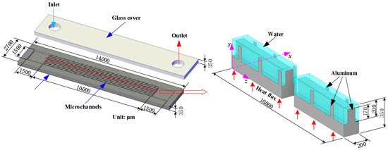 In this work, the flow and heat transfer processes in the MCHSs are all in a steady state, being incompressible and experiencing laminar flow regardless of gravity, other volume forces, and thermal radiation. The temperature of water varies from the channel inlet to the outlet, and the effect of temperature on heat conductivity and dynamic viscosity cannot be ignored, as shown in Table 1. The constant thermophysical properties of water include a specific heat of 4183 J/(kg·K) and a density of 998 kg/m3. The specific heat, density, and heat conductivity of the aluminum are 871 J/(kg·K), 2719 kg/m3, and 202.4 W/(m·K), respectively.