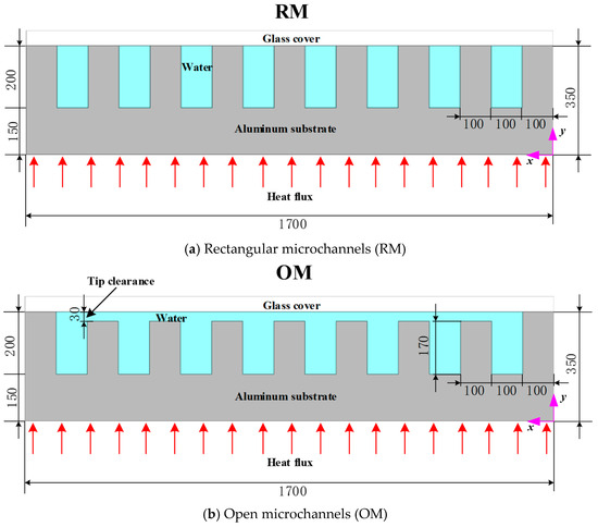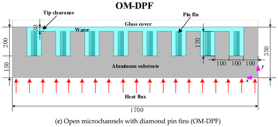 To illustrate the influence of the open structure and diamond fins on the hydrothermal capability, a traditional rectangular microchannel (RM) and an open microchannel (OM) are selected as reference heat sinks. The numerical domain includes eight parallel microchannels with lengths, widths, and heights of 10 mm, 1.7 mm and 350 μm, respectively. The schematics on the x-y planes for the three numerical models are displayed in Figure 2. For the RM, the height of the interval rib is 200 μm, which is equal to the channel height. For the OM, the gap between the interval rib and the glass cover is also 30 μm, making it the same as the OM-DPF. The other geometric dimensions of the three heat sinks are all consistent.