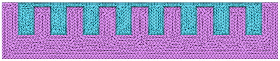 The mesh on the entrance cross-section of the computational model (z = 0 mm, the purple region is solid, and the blue is fluid).