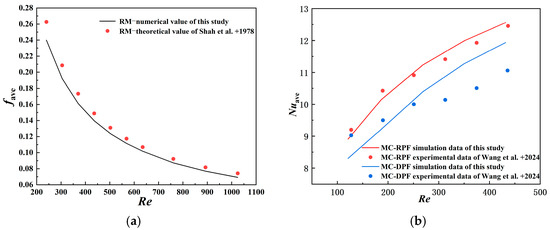 We found that the numerical values and the theoretical values have the same variation trend, as shown in Figure 4a. As the Re increases, the friction coefficient of the RM gradually decreases, which is in agreement with the laminar flow. The maximal error of the two curves for the friction factor is 8.65% at Re = 247. Furthermore, experimental Nuave data for the microchannel with rectangular pin fins (MC-RPF) and the microchannel with diamond pin fins (MC-DPF) in [18] are employed for comparison with the numerical results. The length, width, and height of the microchannel in [18] are 10 mm, 0.35 mm, and 0.5 mm, respectively. The length of the long diagonal, length of the short diagonal, and height and space of the diamond pin fins in [18] are 0.2 mm, 0.15 mm, 0.5 mm, and 1 mm, respectively. The geometric dimensions are similar to those in this paper. The initial fluid temperature and the uniform heat flux are 293 K and 106 W/m2, respectively—the same as in this work. The numerical models with the same geometric dimensions as the experimental sections in [18] are established. The values of Nuave are calculated using the numerical solution for this research for Re = 121~431, and the range of Re is consistent with the results of the experiments in [18], as demonstrated in Figure 4b. The variation trend of the simulated values agrees with the experimental values. For MC-RPF, the numerical results are very close to the experimental results with a maximal error of 3.2% when Re = 121. For MC-DPF, the maximum error of 7.96% is obtained when Re = 121. This finding verifies that the simulation method has good accuracy in terms of reflecting the hydrothermal characteristics in the combined heat sink.