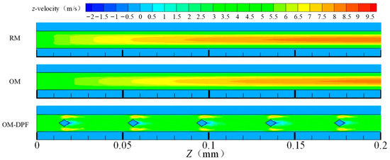 The velocity distributions for the microchannel inlet regions are shown in Figure 5. A uniform fluid velocity is applied at the inlet cross-section for all cases. It is clear that the flow is in the developing stage, and the fluid velocity changes along the flow for the inlet region. For the RM and OM, the velocity in the middle of the channels increases. The velocity gradually becomes higher in the channel center and lower near the sidewalls for the above-mentioned two cases. As the flow passage is enlarged by the tip clearance in the OM, the fluid velocity in the channel center increases more slowly than in the RM. For the OM-DPF, the fluid velocity is redistributed, which is more even than that in the RM and OM. The maximum velocity occurs near the sidewalls due to the separation and acceleration effects of pin fins, while the minimum value occurs in the wake regions of the fins. The intensive impinging effect of the water on the sidewalls allows more heat to be carried away over time.