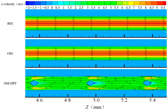 Figure 6 compares the distributions of velocity and streamlines for middle regions of the RM, the OM, and the OM-DPF at Re = 986 (z = 4.5–5.5 mm). It can be seen that the streamlines of the RM and OM are parallel to the channel wall, while the velocity distribution is close to the parabola. For the OM-DPF, the mainstream is separated, and the streamline is deflected. In the wake regions of the fins, tiny secondary flows are generated.