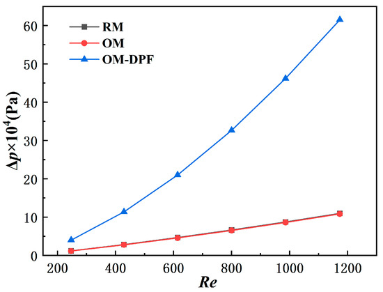Figure 8 presents the pressure drop (Δp) of the three heat sinks. It is apparent that the pressure drops of all structures increase as the Re rises. The RM and OM show similar pressure drops, and their values are apparently smaller than that of the OM-DPF. Moreover, the growth rate of the pressure drop in the OM-DPF dramatically increases for large Re, which results in large energy consumption by the cooling system.