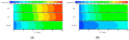 The temperature field on the cooling surface can directly reflect the temperature control ability, as described in Figure 9, which has a vital effect on the service life of the micro-devices. For relatively low Re, the temperatures of the RM and OM rise obviously in the flow direction, as shown in Figure 9a, increasing the thermal stress in the micro-devices. The temperature increase along the flow of the OM-DPF is reduced markedly compared to the RM and OM, which indicates its superior temperature control ability. For the relatively high Re in Figure 9b, the temperatures of three kinds of heat sinks decrease obviously compared to that for low Re. The temperature distributions of the RM and OM are still similar. The single open structure has little influence on the heat rejection effect in the range of this paper. Fortunately, the innovative heat sink shows good temperature uniformity and temperature control ability. When Re = 986, the temperature increases in the RM and OM are 15.24 °C and 15.12 °C, respectively, while that of the OM-DPF is 6.77 °C, which is reduced by 8.47 °C and 8.35 °C compared to the above two heat sinks, respectively.