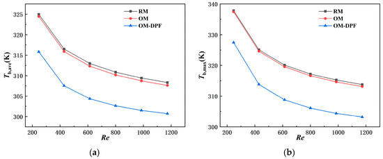 For , the values of the OM and OM-DPF are less than one, as shown in Figure 12b, proving that the two designs can reduce heat transfer irreversibility. For the OM, the value of is 0.95 when Re = 1173—i.e., reduced by 5% compared to that of the RM. Thanks to the impact of the composite construction on the temperature and flow fields of the OM-DPF, the cooling efficiency is improved and is reduced dramatically. When Re = 1173, the of the OM-DPF is reduced by 56.39% and 54.1%, respectively, compared with the RM and OM.