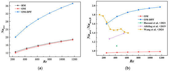 Variation of (a) Nuave and (b) Nuave/Nuave,0 with Re for different designs including Wang et al. [18], Hassani et al. [50], and Alfellag et al. [51].