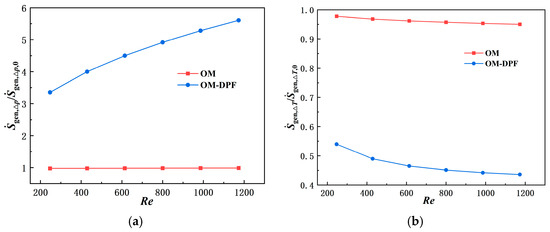Figure 12a,b demonstrate the ratios of friction entropy production () and heat transfer entropy production (), respectively. In Figure 12a, the values of for the OM are slightly less than one, indicating that the gap space can reduce flow resistance and irreversible loss. However, because the gap space is very small, the decrement is not obvious. The of the OM-DPF is greater than one, and the irreversible loss is ever more prominent as Re increases. The blocking and flow disturbance of the pin fins give rise to the serious friction irreversible loss. The friction entropy production in the OM-DPF is 5.61 times larger than that of the RM at Re = 1173.