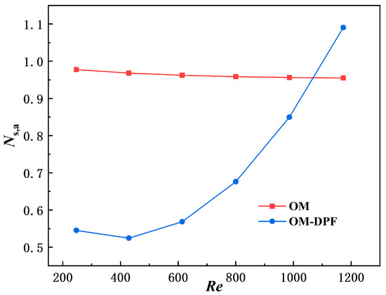 Figure 13 demonstrates the Ns,a for the OM and OM-DPF. The composite construction (OM-DPF) greatly reduces the total irreversible loss for low Re. When Re = 429, the total entropy production reaches a minimum with Ns,a = 0.52 in the OM-DPF, which is half that of the RM. As Re rises, the Ns,a of the OM-DPF increases rapidly due to strong fluid disturbance. The value is even greater than one when Re = 1173, as the disadvantageous effect of the friction loss exceeds the improvement in heat transfer. On the contrary, with the increase in Re, the Ns,a of the OM gradually decreases because of the friction loss reduction and overall efficiency improvement. At Re = 1173, the total entropy production of the OM is the smallest, with Ns,a being 0.96—i.e., 4% lower than that of the RM.