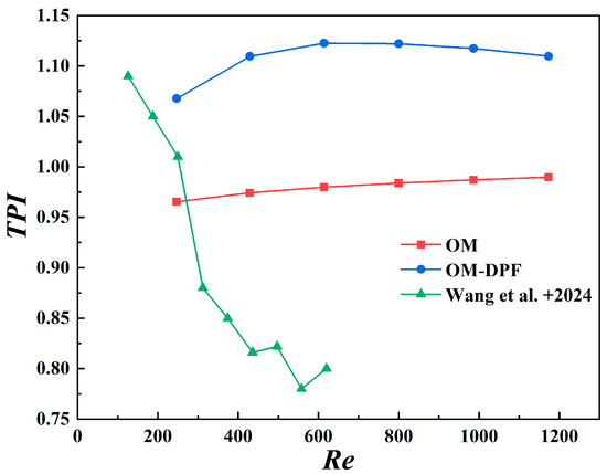 The overall efficiency of the OM-DPF is compared with the OM and the closed diamond fins in [18] using the TPI. In Figure 14, the TPI of the OM increases slightly as the Re increases, but the values are always less than one. This shows that the single tip clearance structure is not helpful for increasing the total capability. Compared to the traditional RM, the pump power advantage is offset by the weak heat transfer in the OM. The total efficiency of the closed fins in [18] presents a downward trend as Re rises. For Re < 250, the total efficiency of the above design is larger than that of the RM. However, it loses its overall capability advantage due to the friction loss induced by the fins under high Re conditions. The innovative heat sink obtains the highest TPI with 14.56% and 40.32% increases compared to the OM and the closed pin fins (heat sink in [18]) when Re = 614.