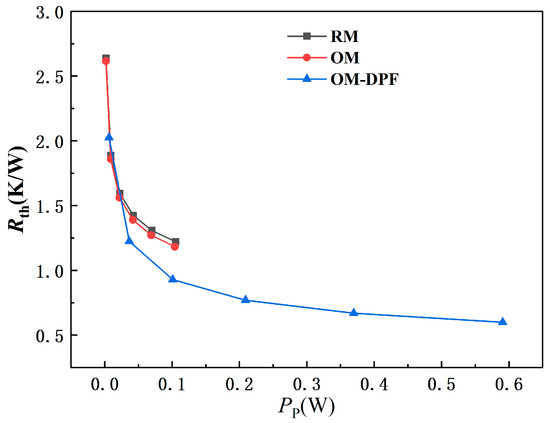 Figure 15 demonstrates variation in the thermal resistance with the pump power. The Rth of the OM is slightly lower than that of the RM for a certain pump power. We can see that the OM-DPF achieves the best overall efficiency. When PP = 0.1 W, the thermal resistances of the RM, the OM, and the OM-DPF are 1.22 K/W, 1.18 K/W, and 0.93 K/W, respectively. Thus, the value of Rth for the OM-DPF is 23.77% and 21.19% smaller, respectively, than those of the RM and OM. When the Rth of three MCHSs is similar (1.22 K/W, 1.27 K/W, and 1.22 K/W for the RM, the OM, and the OM-DPF), the pump power of OM-DPF is the lowest at 0.04 W, followed by the OM at 0.07 W, while that of the RM is the highest at 0.11 W. Thus, the OM-DPF obtains 63.64% and 42.86% lower pump power than the RM and OM, so the economic advantageousness of the novel design is proved again.
